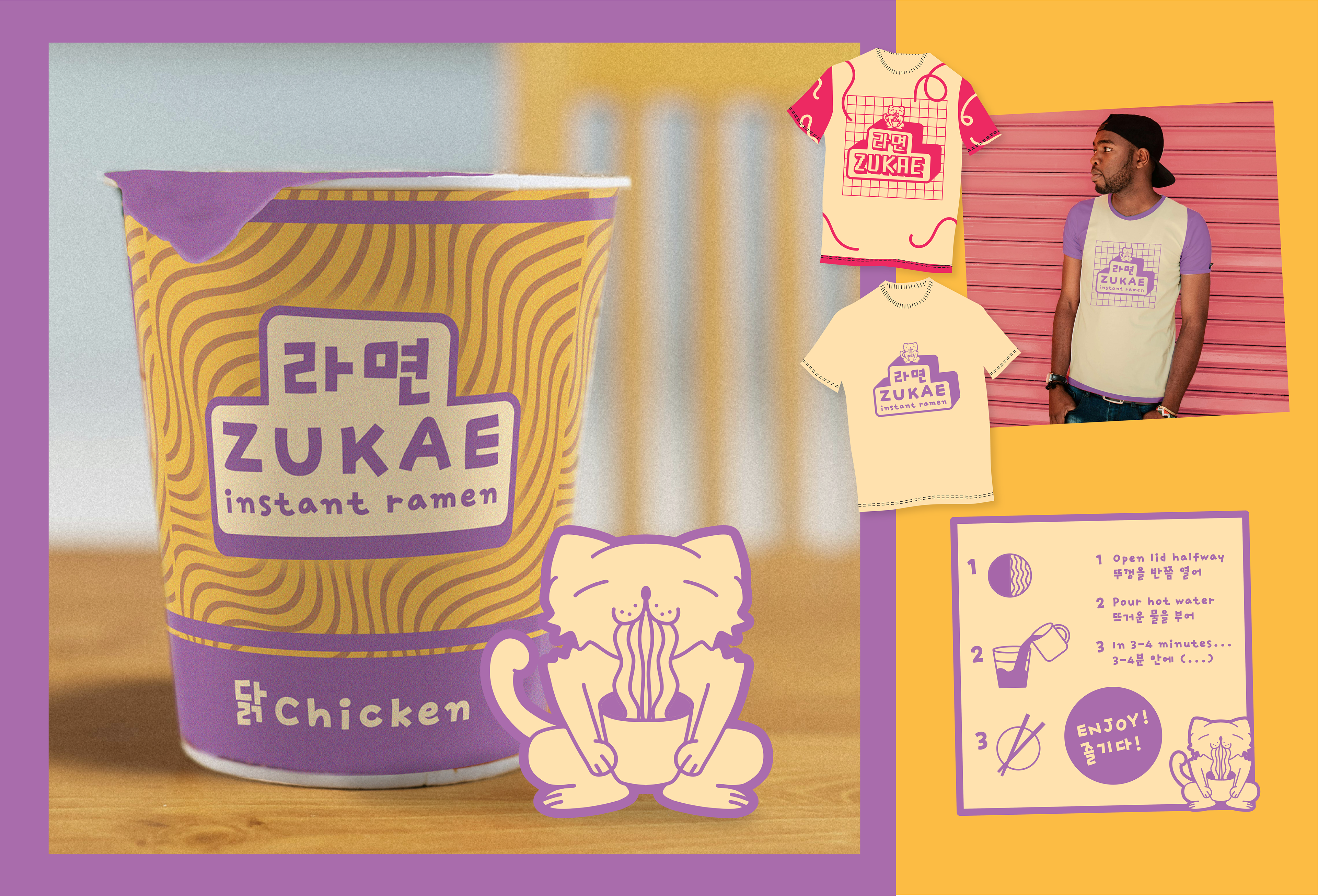 Zukae is an instant noodle brand made for late nights, quick breaks, and cravings. It’s fast, flavorful, and easy to throw together in your go-to bowl. I used the colors lavender and a dandelion yellow to associate this ramen with a more relaxed and warm feeling, as opposed to going with more energetic colors.